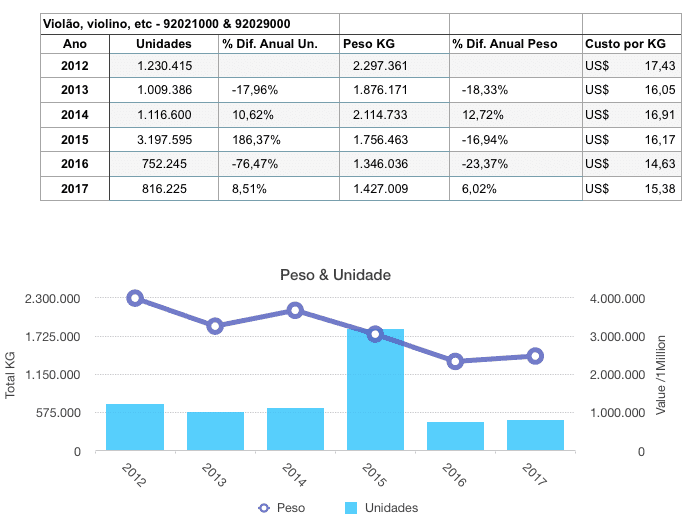 Colocamos abaixo, dados copilados da importação de instrumentos musicais no Brasil. Atente com a bolha da importação que ocorreu no período em que o Real estava estava valorizado, entre 2011 e 2012. Confira.