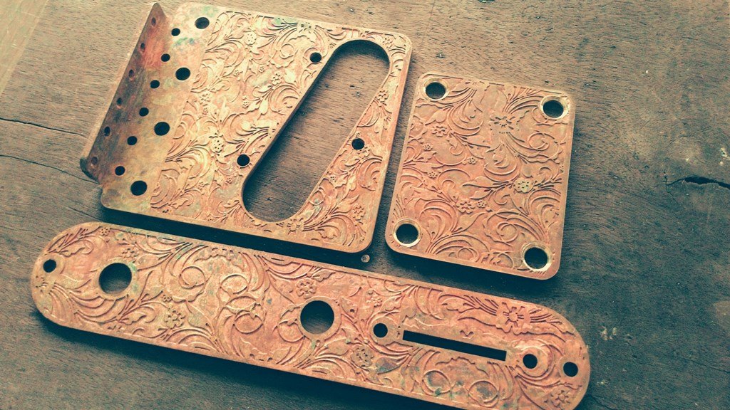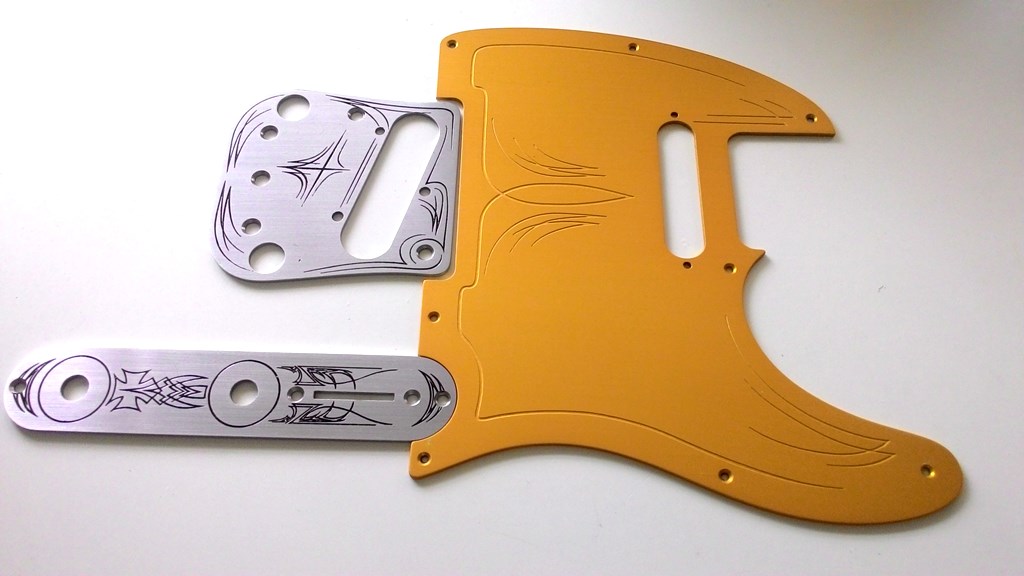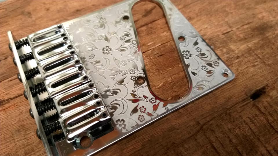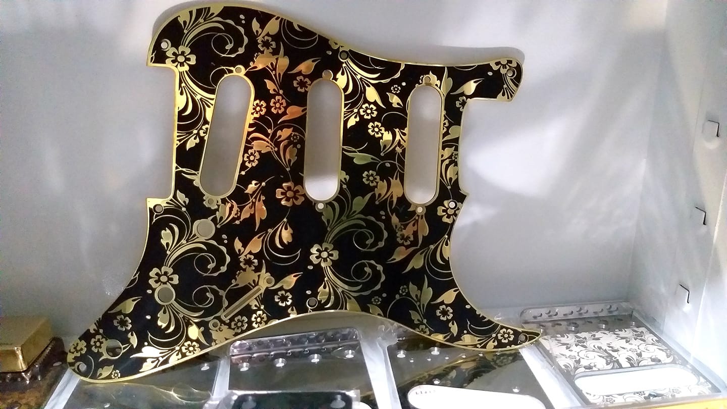 A maioria dos produtos é customizável. Escudos, pontes, neck plates, control plates, molduras, capas de captadores etc. Enfim, já customizamos de tudo! O cliente pode optar por produtos padrão ou nossas criações, como a consagradíssima linha Flower Theme, ou pelo seu próprio projeto. Os neck plates são os produtos mais desejados quando pensamos em customização. Os clientes adoram seus instrumentos, principalmente ter algum tipo de homenagem nele.