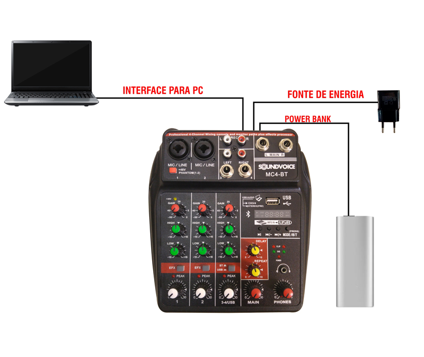 Equalizador 2 bandas por canal (Agudo e Grave)