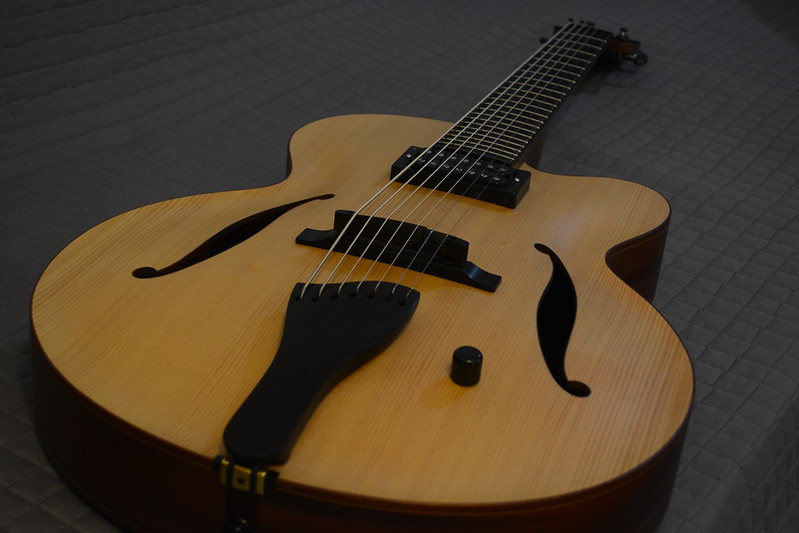 Adriano Guerra: Depois de ter feito uma meia dúzia de guitarras sólidas, as archtops começaram a me chamar a atenção. Cheguei a fazer algumas coisas só com o pouco que havia na época na internet, meu irmão ampliava imagens que eu encontrava e mandávamos imprimir em tamanho real. Até que por volta de 2008, quando eu ainda não sabia nem importar um parafuso, meu amigo Celso Machado (Oficina G3) me conseguiu o livro “Making an Archtop Guitar” do Robert Benedetto. Levei mais de um ano para fazer a primeira guitarra a partir do livro, e quando terminei, acho que me bateu uma depressão pós-parto, pensei que não haveria público pra isso aqui no Brasil, que ninguém botaria fé em mim. Já estava indo pro lado dos violões quando a namorada de um amigo, em 2012, encomendou uma archtop de presente pra ele. Quando terminei a guitarra, saí mostrando ela para o máximo de músicos que eu pude e, com o retorno positivo deles, aconteceu a virada no meu trabalho com as guitarras acústicas.