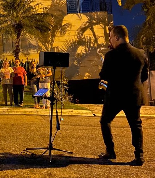 Está vendo? Este é um exemplo de que, mesmo nos momentos que parecem mais difíceis, sempre há uma luz no final do caminho. Quer mais? Marquinho continua: “Na expectativa de que em julho as coisas voltariam ao normal, não dei sequência ao projeto nos condomínios, mas desenvolvi um acessório revolucionário para saxofone. Uma empresa gostou da ideia e juntos lançamos o acessório que já se tornou um sucesso entre os saxofonistas no Brasil: o UP! by Plastireed & Marquinho Sax. Além disso, participei de diversos vídeos collab com vários artistas do Brasil, Peru, Venezuela e também ministrei uma masterclass para músicos do Panamá”.