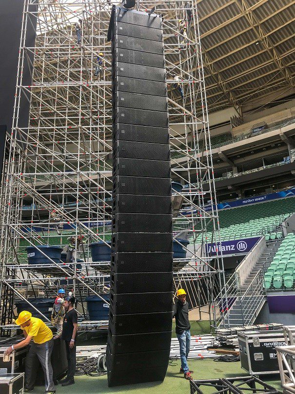 O sistema MLA da Martin Audio foi fornecido pela Gabisom Audio Equipment, cujo engenheiro de sistemas Eder Moura explica: “O show teve uma audiência de 48 mil pessoas em uma área de cobertura de mais de 500 pés. Usamos seis arrays, um array L/R principal com 20 MLA e dois MLD. O lado L/R tinha um sistema formado por 21 MLA e um MLD, um L/R traseiro com quatro MLA, além de 16 subwoofers MLX por lado e 12 MLA Compact para front fill”.