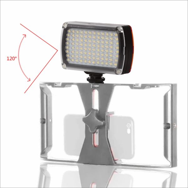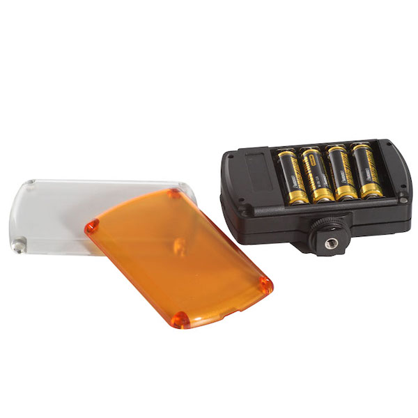 Iluminador LED para câmeras e smartphones SP-96: com ângulo de iluminação de 120º, este acessório fornece luz para reduzir sombras e contornos indesejados, além de imagens mais vívidas. Conta com 96 LEDs temperatura de cor 5500K (3200K com filtro), fluxo luminoso de 860 lumens e potência máxima de 9W. É leve e resistente com duas opções de cor. Acompanha 4 pilhas AA, suporte para bateria e também pode funcionar via USB.