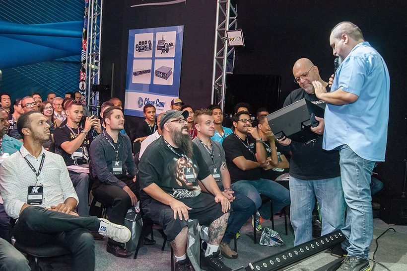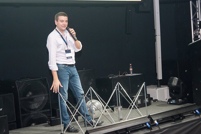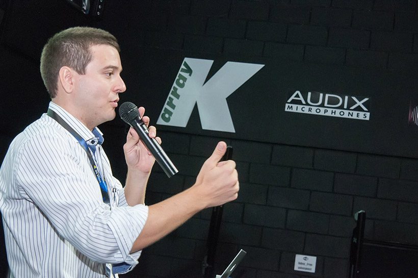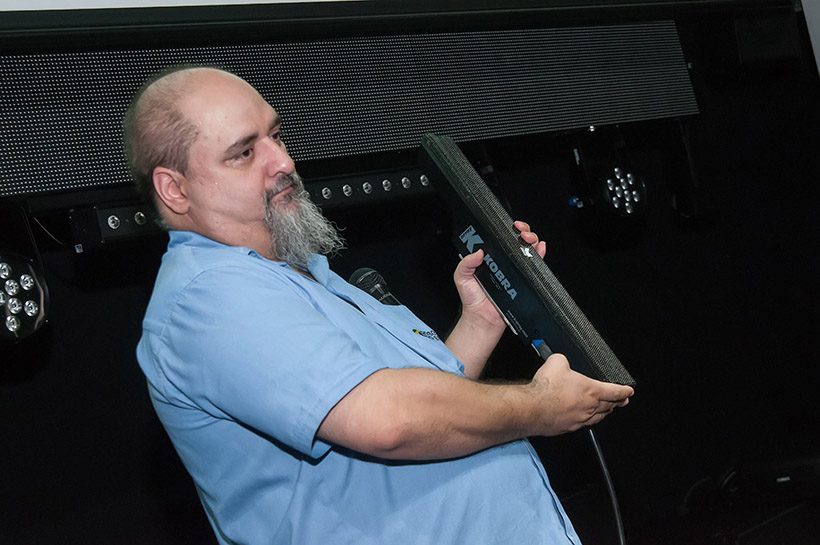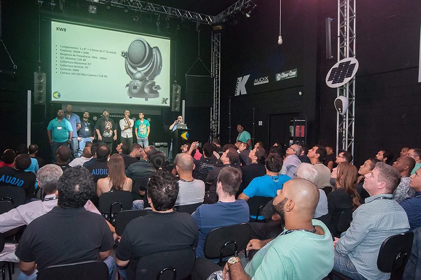 O foco da Gobo para esse evento foi nas soluções em sistemas de áudio da fabricante italiana K-Array, marca que representam no Brasil. Com cerca de 100 pessoas na plateia, o especialista Valdinei Vieira (Jabá) apresentou a fabricante através de um pouco de história e contando a tecnologia por trás dos seus equipamentos. “Há alguns anos nós sonhávamos de como os sistemas seriam no futuro, com construções robustas e leves, potência e clareza aliados. Com a K-array este futuro chegou para nossas vidas e projetos”, segundo palavras do especialista.