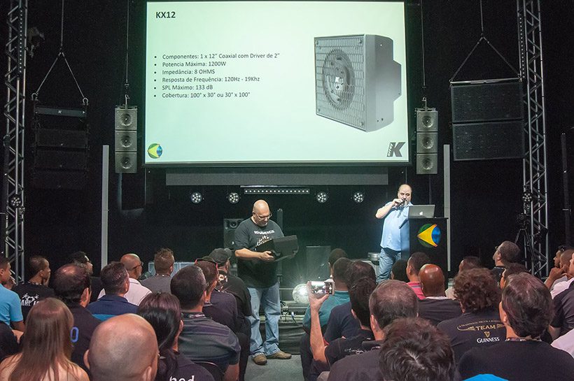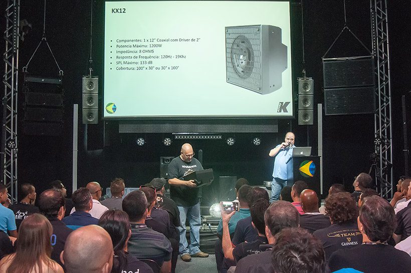 Em seguida foi o momento de apresentar os lançamentos que a Gobos do Brasil está trazendo para a linha de sistemas portáteis da fabricante. O grande destaque ficou para a KX12, pensada como novo elemento para compor todas as linhas de “combos” portáteis da marca. A caixa é uma unidade com alto-falante coaxial de 12” com uma corneta de 100º por 30º com orientação ajustável, que permite variar a cobertura dependendo da necessidade. Partindo para um design quadrado, mais reduzido em comparação com as anteriores colunas KK, KY e KP, o sistema responde de 120 Hz a 19 kHz.