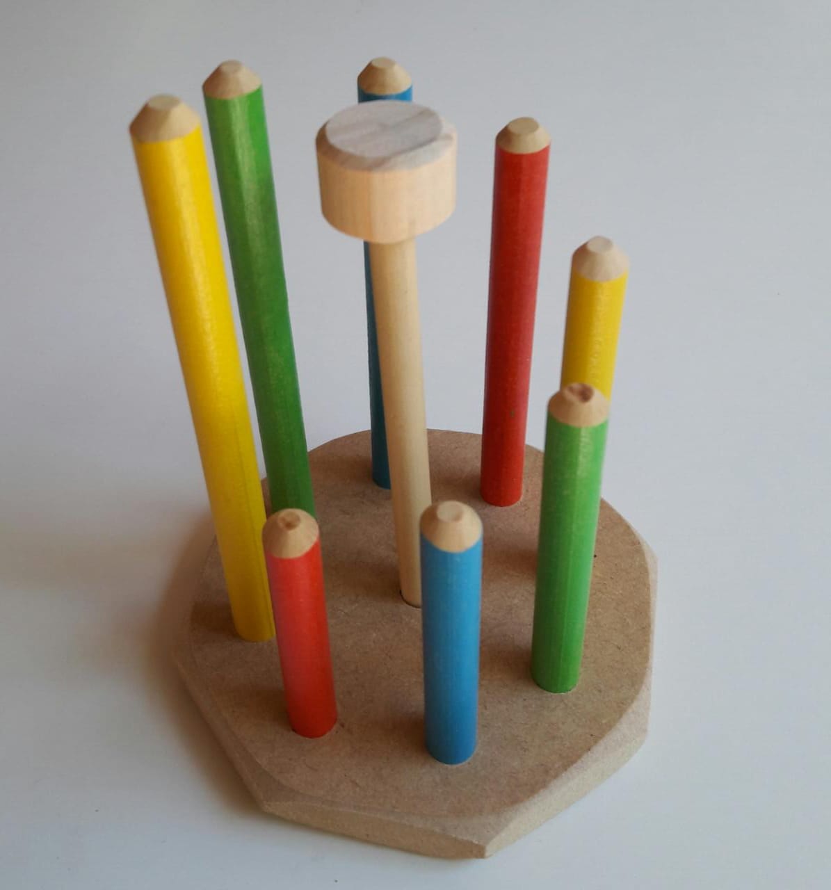 A oficina fica em Salto, interior de São Paulo. “Somos dois fazendo tudo, eu e minha esposa Keka. Tudo é feito à mão. Usamos algumas máquinas comuns para madeira e só. O processo é todo artesanal — colagem, lixamento, tingimento, furação, pintura, montagem.”