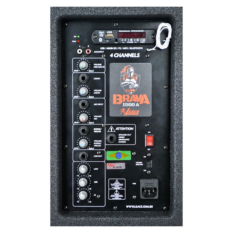 Os quatro canais na caixa podem ser usados simultaneamente. Traz conexões USB (MP3, SD card, P2 e Bluetooth), auxiliar RCA, entrada de linha, entrada de microfone, entrada para guitarra/violão, saída de linha e equalizador de 3 vias (low, mid e high). Também conta com uma saída P10 para Brava passiva, seletor de voltagem 120/230V e entrada AC com fusível de reserva.