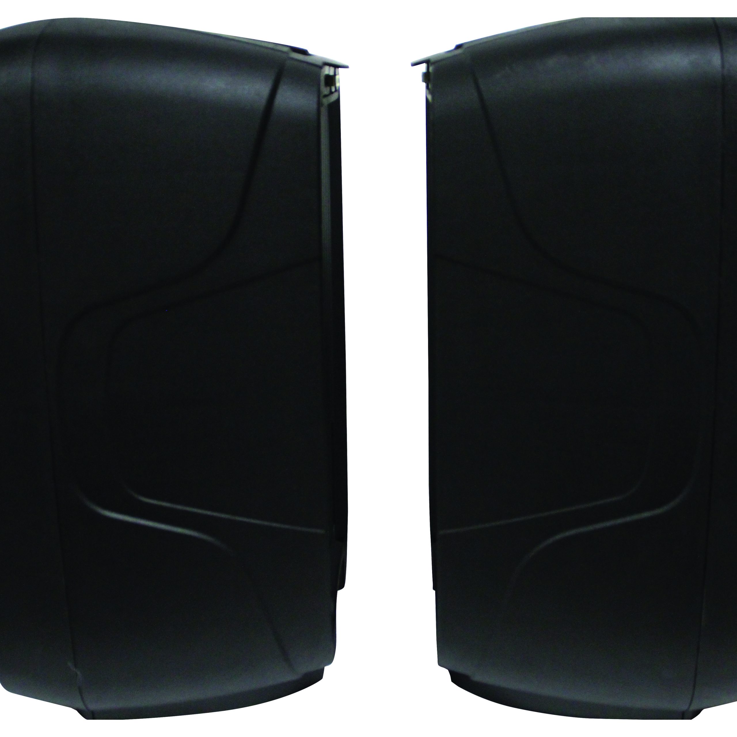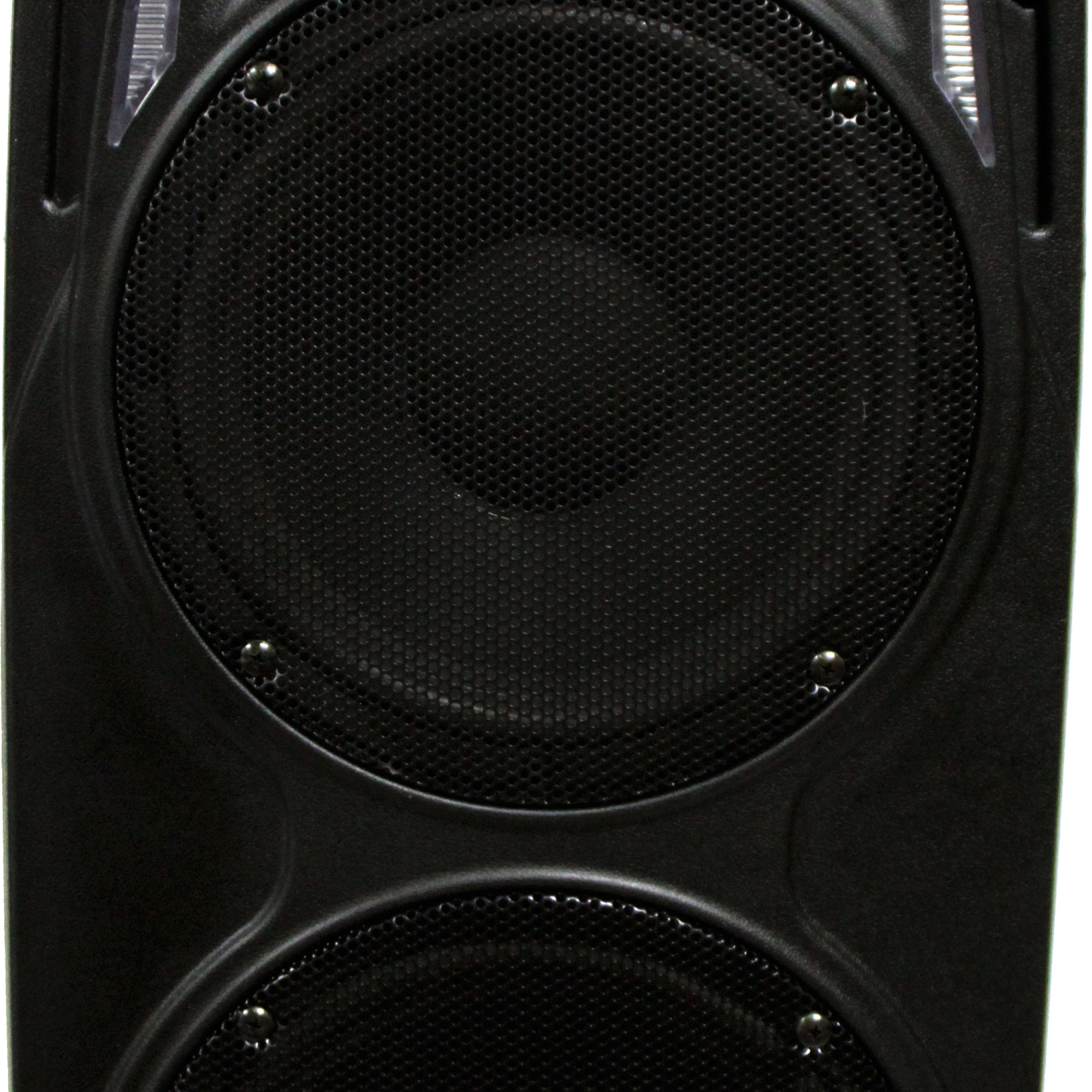 Sistema de P.A. portátil composto por duas caixas ativas com 2 falantes de 10” e drives de compressão de 1” de titânio. Possui um mixer amplificado de seis canais e MP3 player.