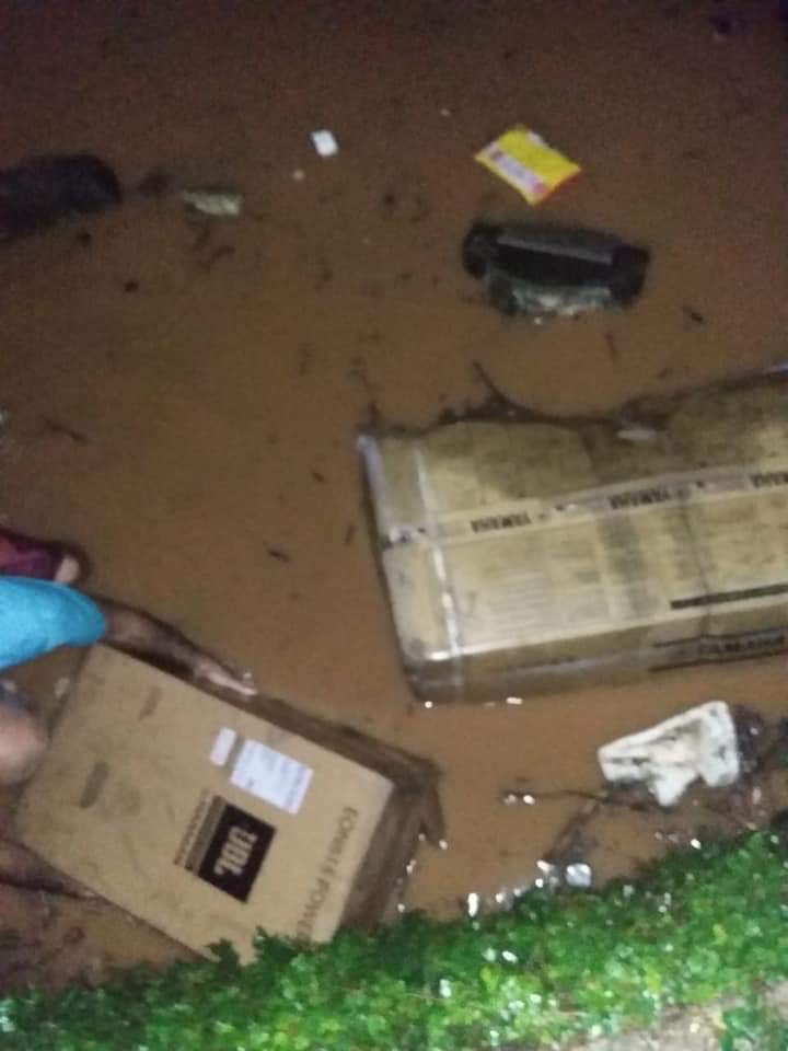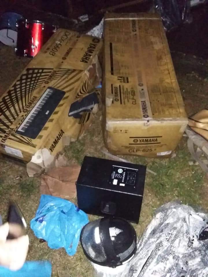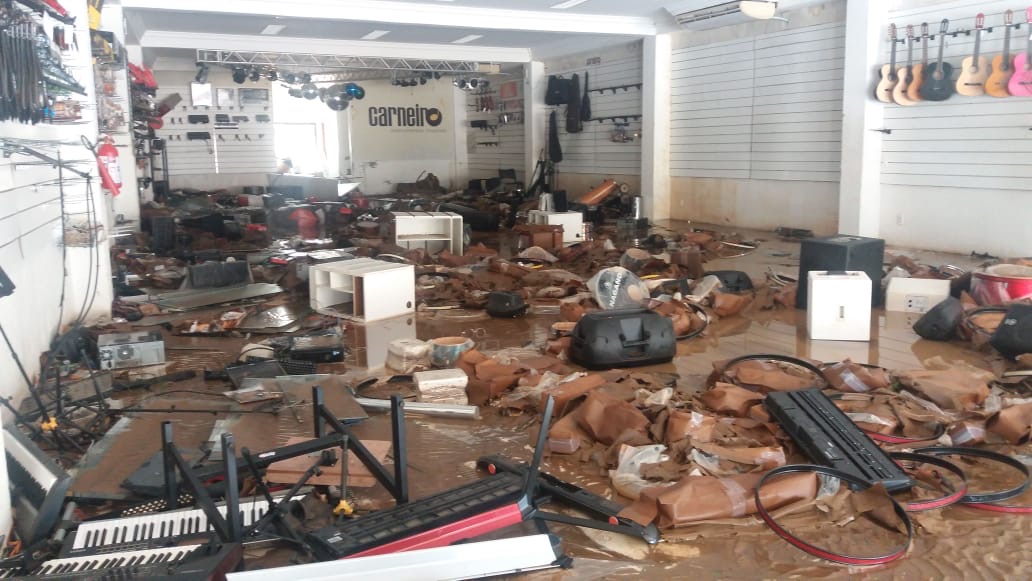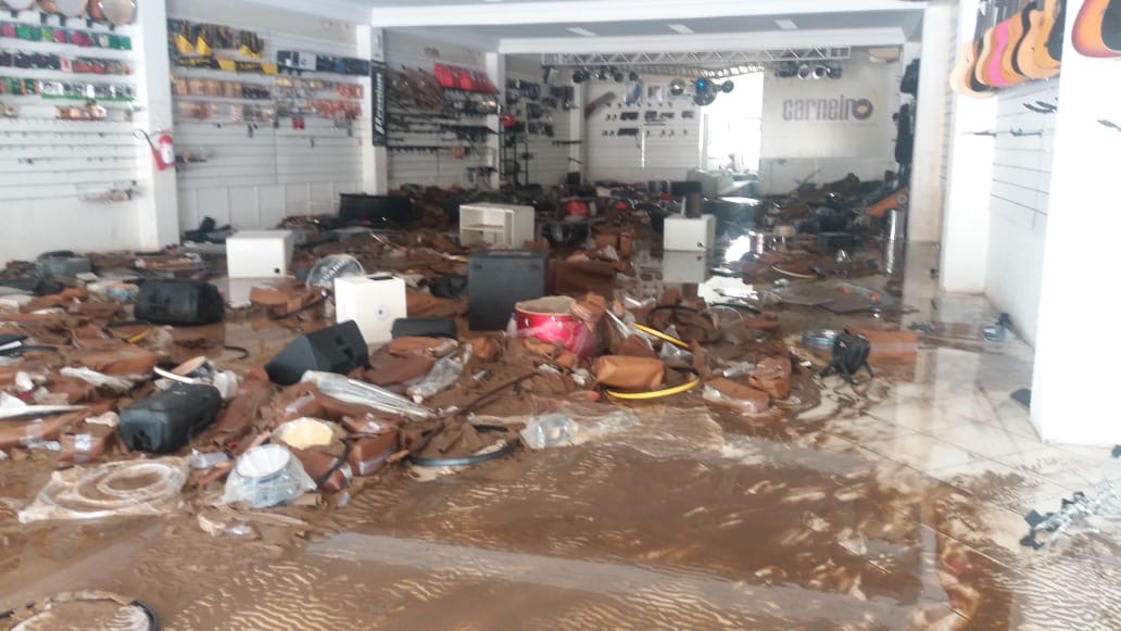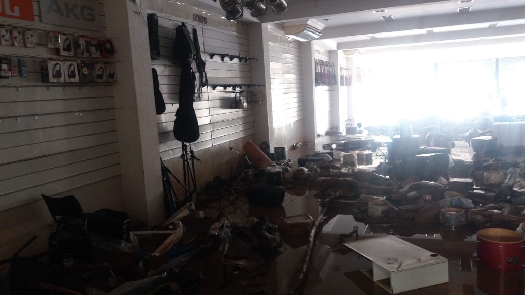 A força d’agua foi tanta que as portas de metal cederam e a água entrou no local, alagando não só a superfície mas também arrastando instrumentos e outros equipamentos para o exterior da loja.