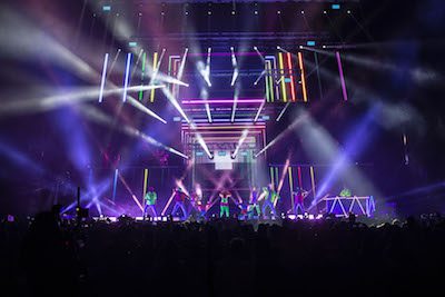 “Fey queria transmitir uma forte sensação de empoderamento feminino no show e na produção em geral”, explicou Pablo. Foi isso que o inspirou para criar essa forma geométrica com a estrutura, que contrasta com as linhas retangulares das cinco grandes superfícies de vídeo LED no palco. Quando está na posição ‘home’, a menor das seis treliças fica posicionada logo acima da tela central e irradia a luz do palco para baixo, aumentando a profundidade total da estrutura.