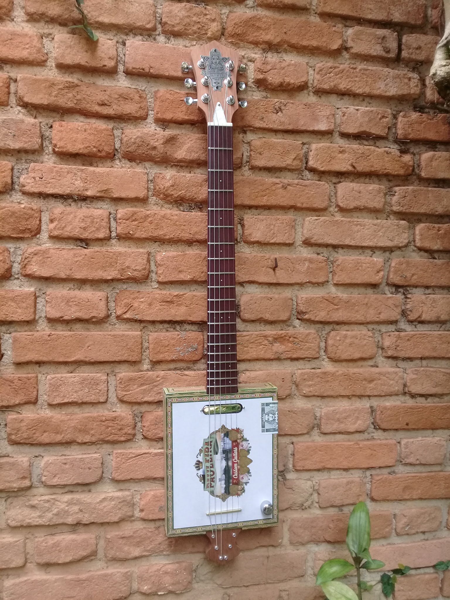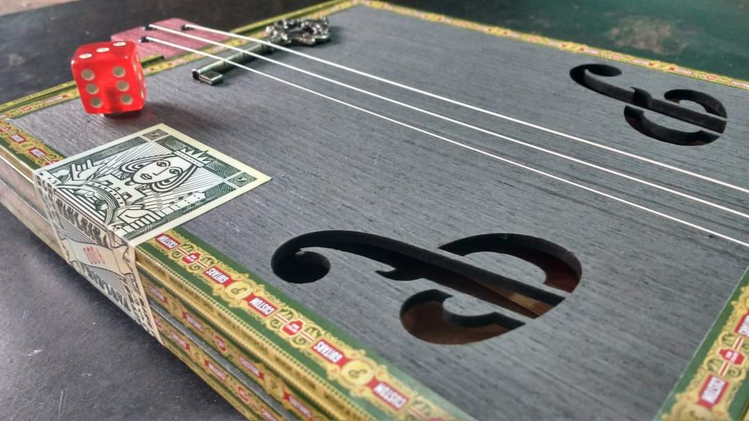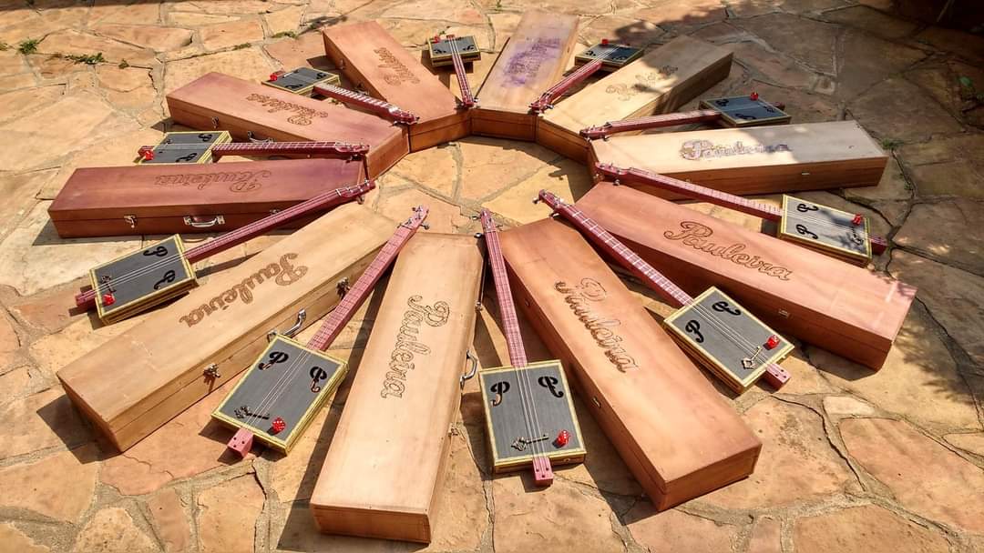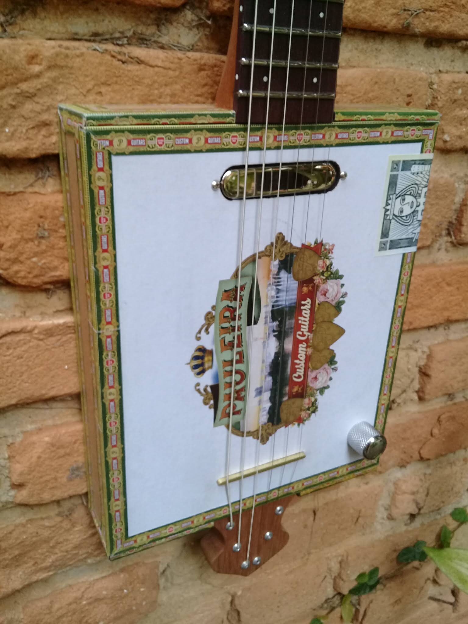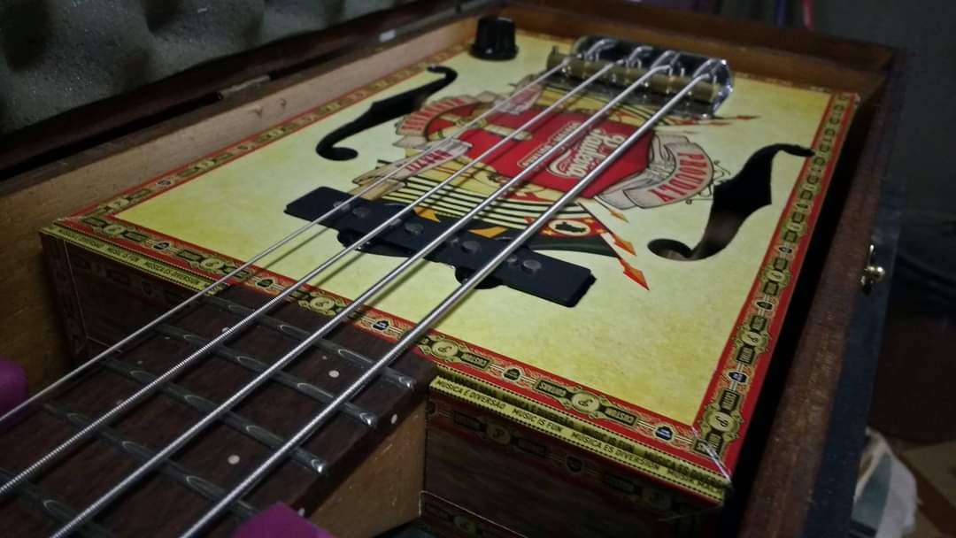 E o outro instrumento é a guitar box. Inspirada nas guitarras de caixas de charutos, criamos também um modelo próprio de 6 cordas, de 3 cordas e até um baixo pois além de ser um tipo de instrumento que me abriu muitas portas, me apresentou muitos parceiros que tenho até hoje, é um tipo de construção descompromissada de comparações e espontânea. A ideia é criar guitar boxes com sobras de materiais, reutilizando madeiras, caixas descartadas e esse lado mais criativo da construção acabei investindo em cursos presenciais e on-line para ensinar pessoas a criarem algo genuíno. Por isso me identifico muito com guitarras de caixa.