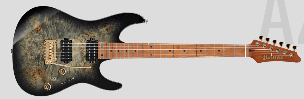A nova guitarra elétrica Premium AZ242PBG traz braço AZ Oval C em Roasted Maple, tampo em Poplar Burl e corpo em American Basswood, com 24 trastes Jumbo Stainless Steel, ponte tremolo Gotoh T1502 e mais.