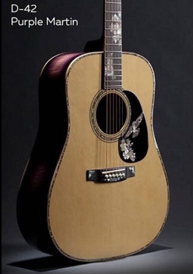 D-42 Purple Martin Flamed Myrtle: É o quarto instrumento da série Purple Martin. O tema “Purple Martin” é inspirado em um pássaro nativo da Pensilvânia, onde estão localizadas a sede e a fábrica da Martin Guitar. Limitado a 100 instrumentos, este modelo inclui inlays de pérola de tipo 42 em todo o corpo, além de inlays decorativos no diapasão, a imagem de um pássaro roxo e flores de louro de montanha, a flor do estado de Pensilvânia. Possui um tampo em abeto Engelmann e um fundo e anéis em Myrtle queimado. Cada modelo inclui uma etiqueta assinada pelo presidente e CEO da C. F. Martin & Company, Chris Martin, e vem com cordas Martin Authentic Acoustic Lifespan 2.0.