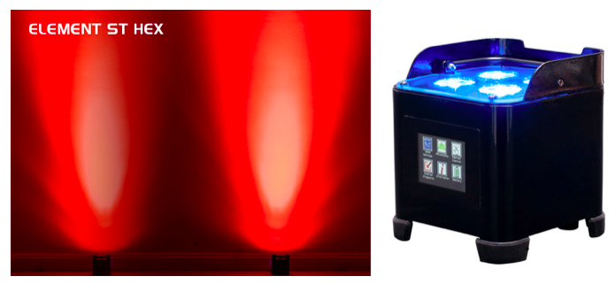 Outro lançamento é o Element ST HEX para iluminação ascendente. É um aparelho LED sem fio com design compacto. Possui uma tela sensível ao toque colorida para programação e designação de endereço DMX. Usa quatro LEDs RGBAW+UV de 6 W para gerar um wash colorido com um ângulo de feixe de 20º.