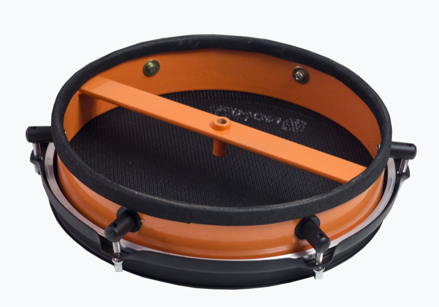 Pads de estudo: Há três modelos em linha produzidos com as peles Mute. Tiago descreve: “Possuem estrutura extremamente reforçada, sendo construídos com aros de bateria e corpo de alumínio. Ou seja, oferecem rebote realístico, possibilidade de afinação e toda a dinâmica que um músico precisa ter ao estudar. Outro diferencial é que eles possuem o nosso exclusivo sistema wire, que oferece um leve som de esteira, transformando o estudo em algo mais interativo. Podem ser encaixados em estantes de pratos ou utilizados sob alguma estrutura”. Disponível em três tamanhos: 8”, 10” e 12”.