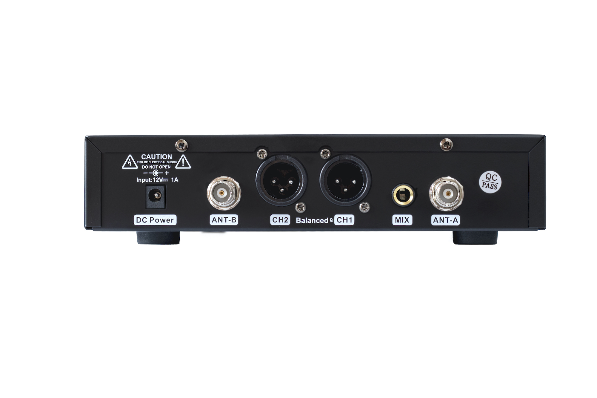 A base/RX/receptor D-9000 possui duas antenas omnidirecional de 1/2 de comprimento de onda com conexão BNC, e display com informações (canal, frequência, nível de AF e RF e antena usada).