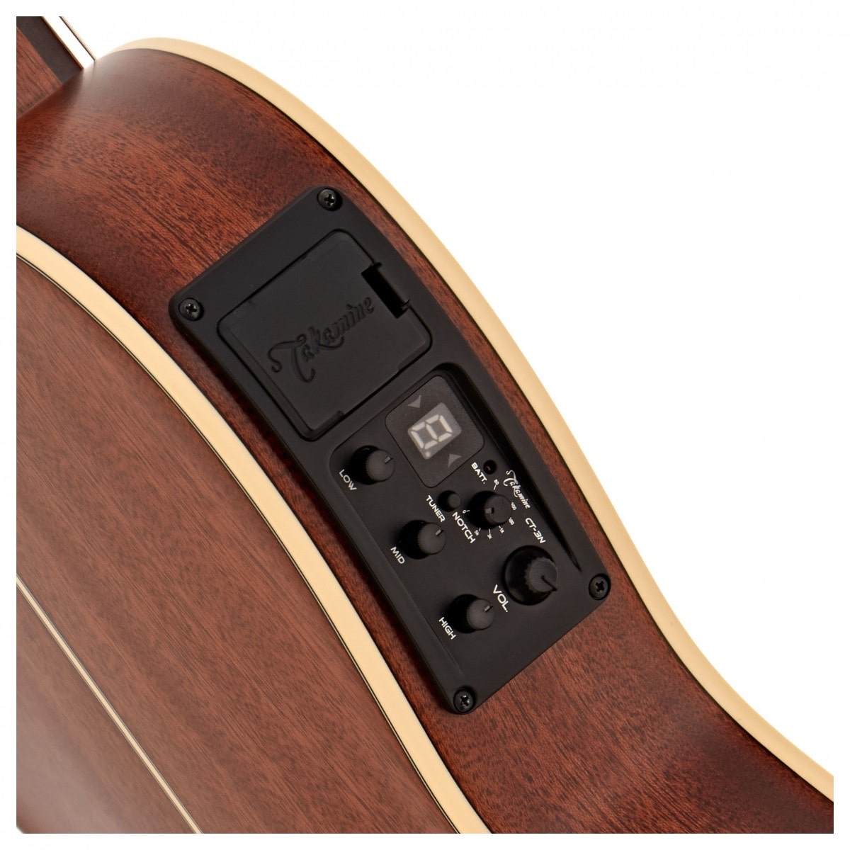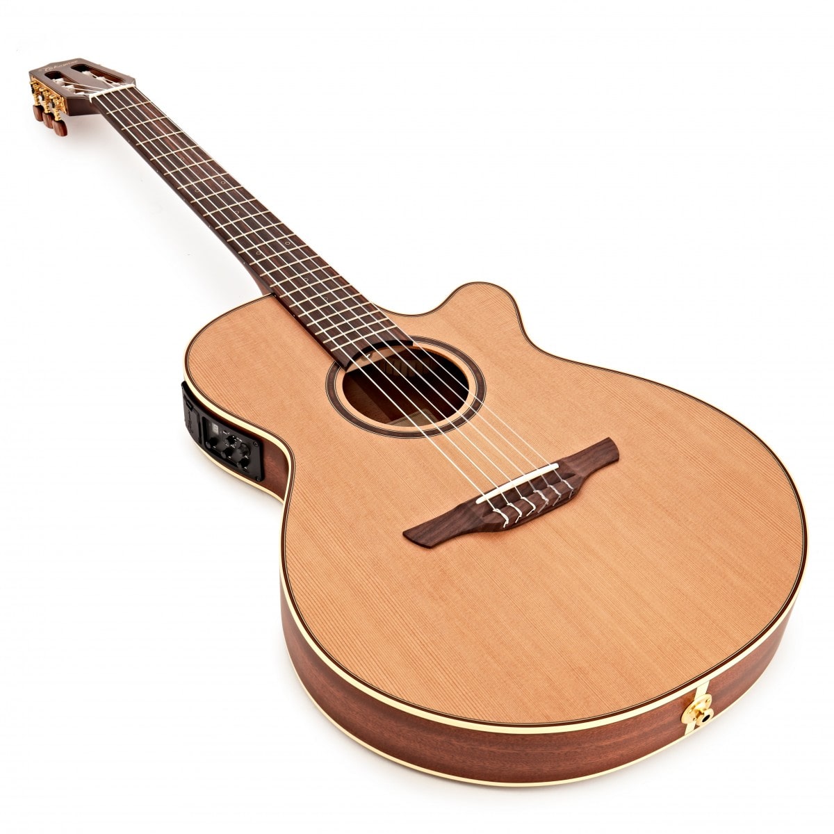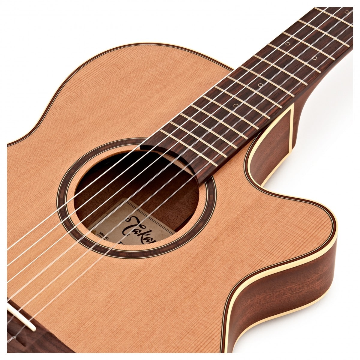 O Takamine TSP148NC é um violão artístico de náilon Flat, com acabamento fosco, tampo em solid cedar, corpo em sapele e escala em rosewood. Traz encordoamento de tensão normal, tarraxas douradas e âmbar, pré-amplificador CT-3N. Acompanha case.