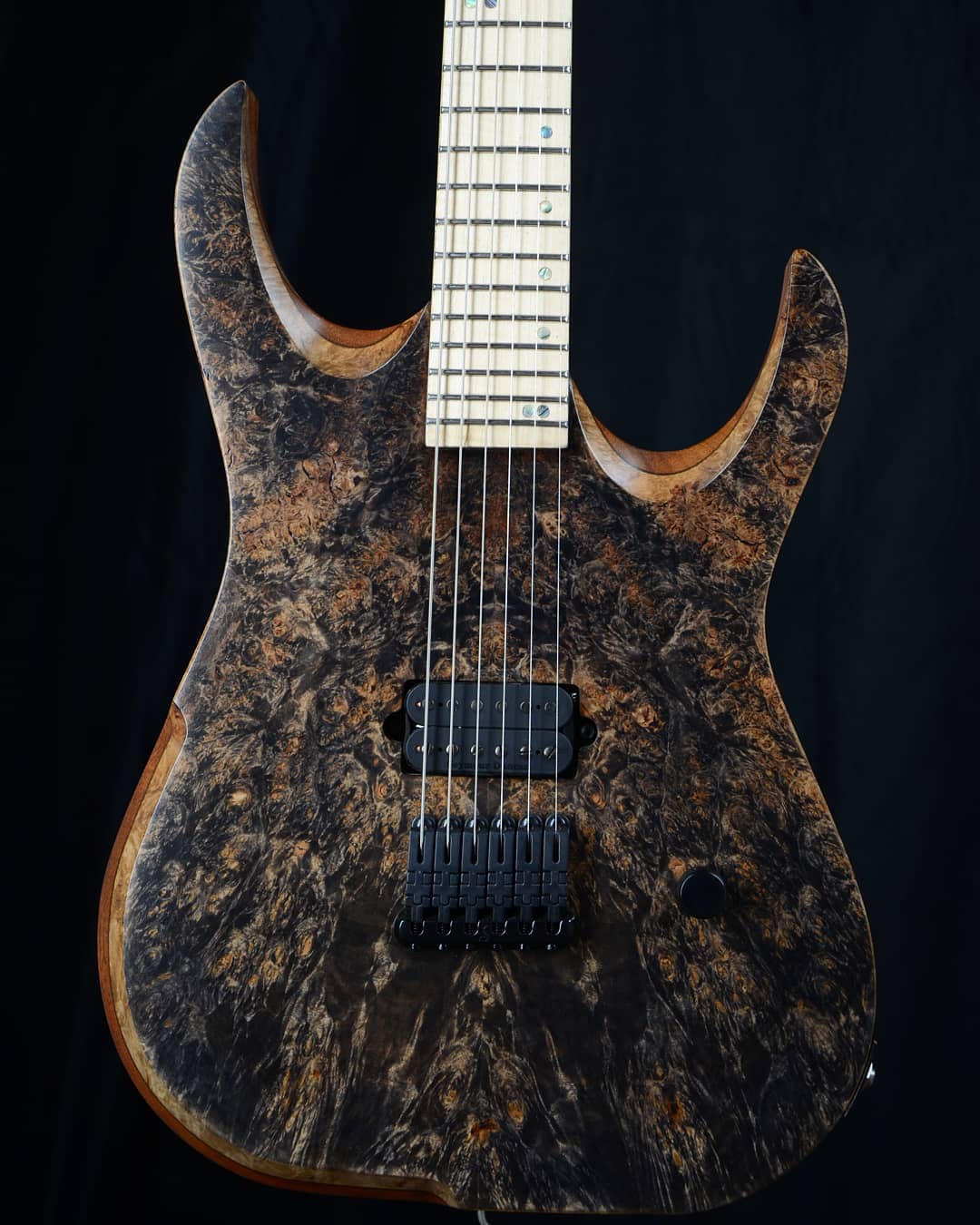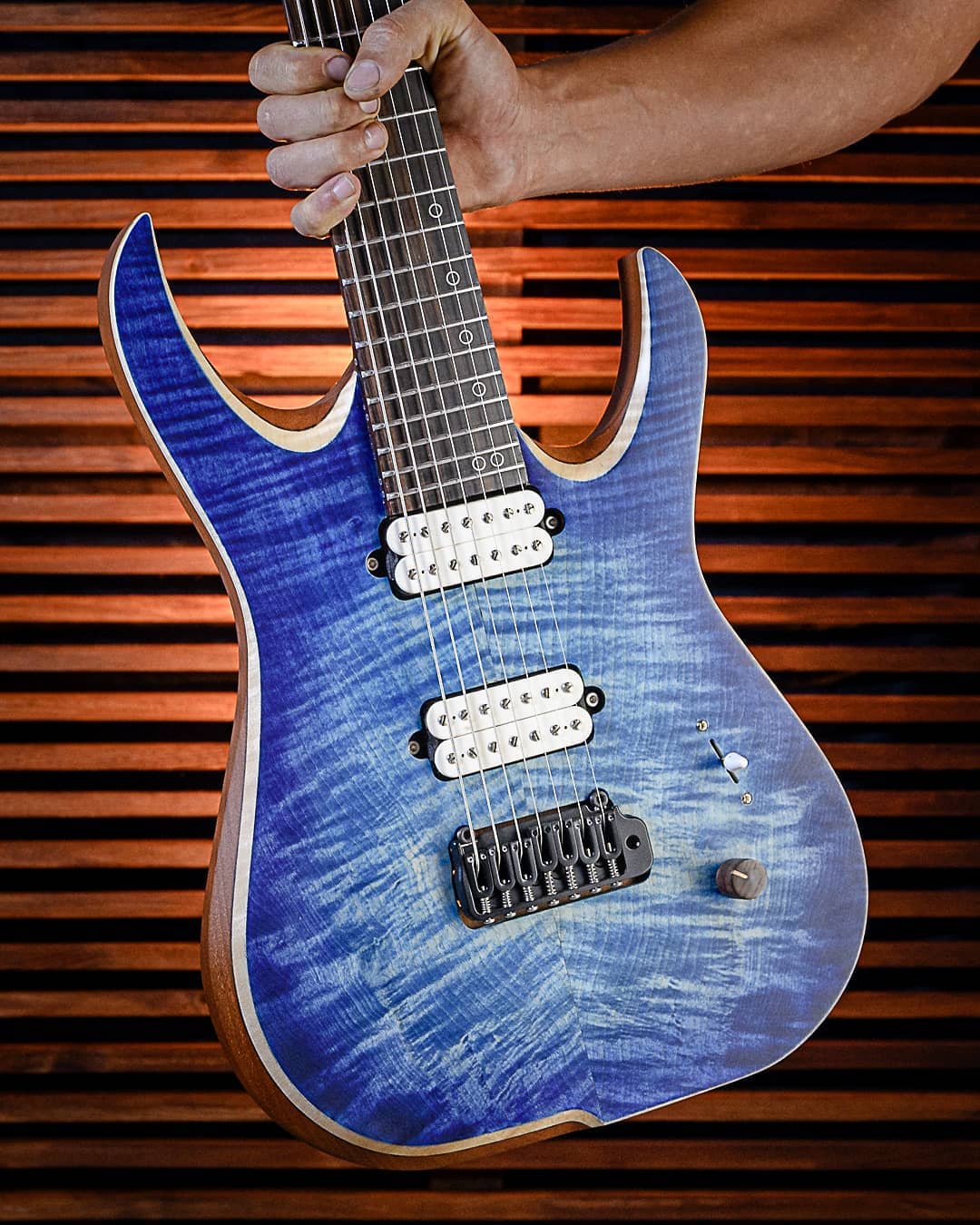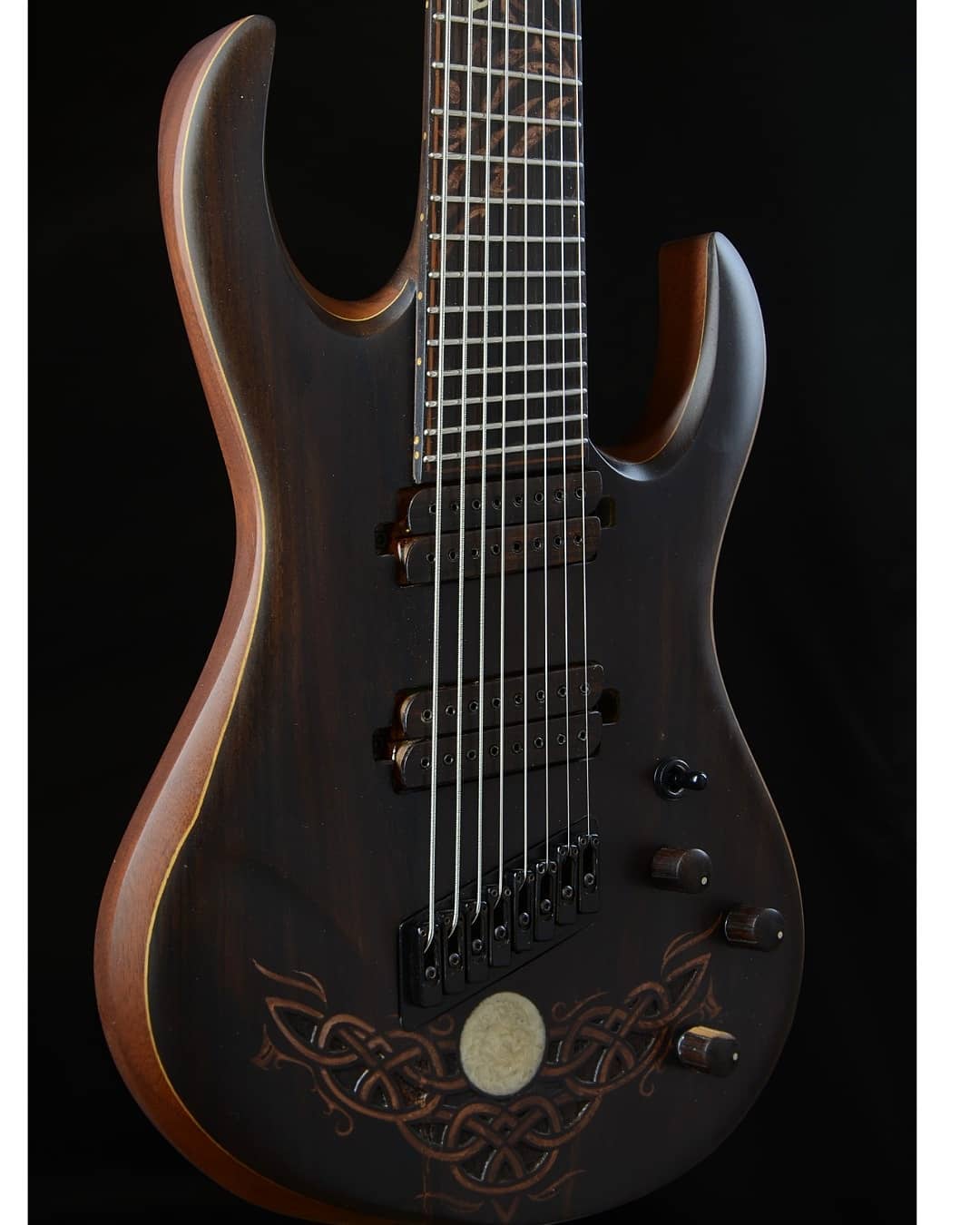 Na parte eletrônica, o modelo traz humbuckers Seymour Duncan Nazgul (ponte) e Sentient (braço), voltados tanto para alta ganho quanto para passagens mais dinâmicas, com graves sólidos e definição nos limpos e solos. O controle é simples, com volume, tone e chave de três posições.