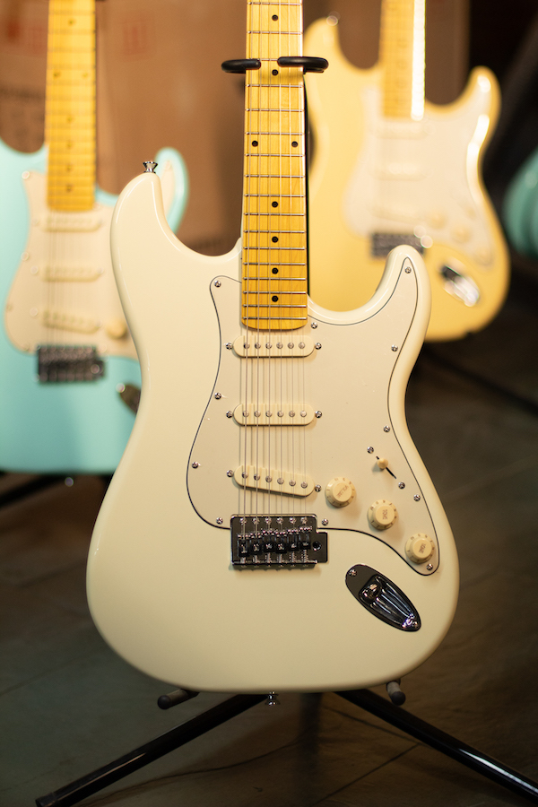 - Captação: 3 single coil, na cor creme