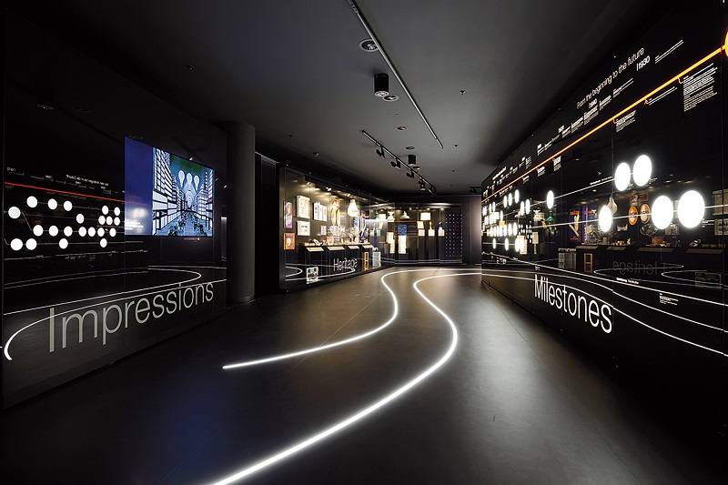O showroom revela o espectro de experiência e produtos oferecidos pela Osram Licht AG. Cobrindo dois níveis, esse mundo do entretenimento informativo inclui conteúdo de cinema, áudio e vídeo, várias unidades de iluminação e efeitos de fumaça. No térreo, um sistema de paredes divisórias de vidro móvel permite diferentes variações da sala: aberta para coletivas de imprensa e grandes eventos; fechada como uma área versátil para oficinas.