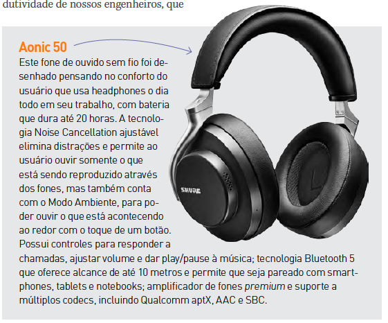 Chris: No segmento de fones de ouvido, lançamos recentemente o Aonic 50, nosso primeiro modelo sem fio. Projetados com décadas de experiência em áudio profissional, os fones sem fio com Noise Cancelling Aonic 50 reúnem em um só produto som sem fio com alta qualidade de estúdio, conforto e durabilidade excepcionais. Em nossos negócios de sistemas, acabamos de lançar três importantes produtos: o IntelliMix Room, que é o primeiro software de processamento de áudio para computadores com Windows 10 totalmente otimizado para uso com microfones de sistemas em rede da Shure; o microfone linear de instalação fixa MXA710 e um novo alto-falante em rede MNX5-C para melhorar a qualidade do áudio de conferências virtuais.