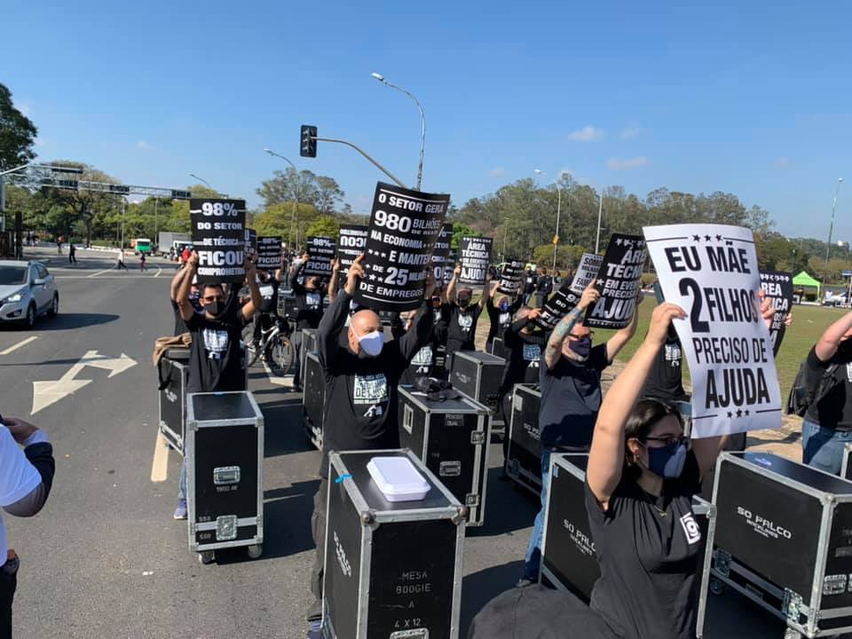 A passeata com cases contou com a participação de técnicos de som, iluminação e imagem tendo como intuito pedir aos governantes um protocolo para retomar as atividades e ajudar o setor que está parado desde o começo da pandemia.