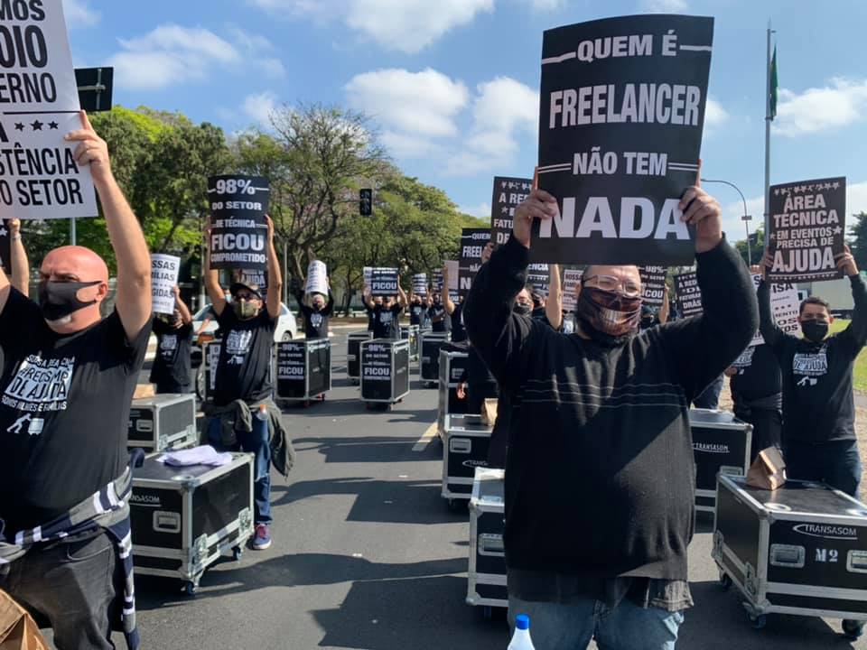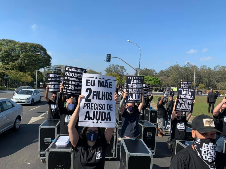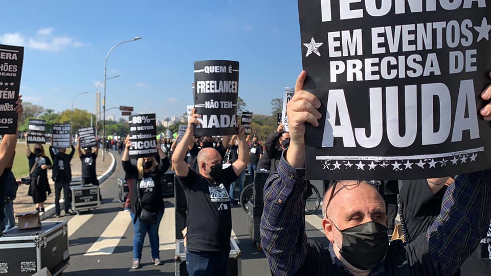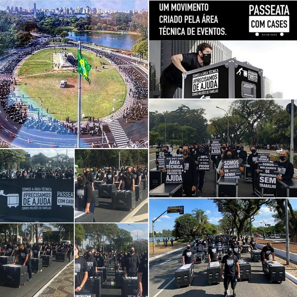 Vendo isto e com o intuito de protestar pedindo ajuda e atenção para o setor foi realizada no dia domingo 02/08 uma passeata com cases em São Paulo, com a participação de técnicos de som, iluminação e imagem.