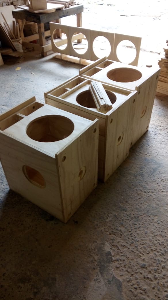 Na fábrica, para a construção das caixas, a UV está trabalhando com máquinas como serra circular, lixadeiras, alguns tipos de máquinas do mundo da marcenaria que “são armas que utilizamos para poder lapidar a matéria-prima que vem crua — a chapa de madeira lisa que se transforma nessa caixa acústica maravilhosa, com toda essa tecnologia aplicada nela”, enfatiza.
