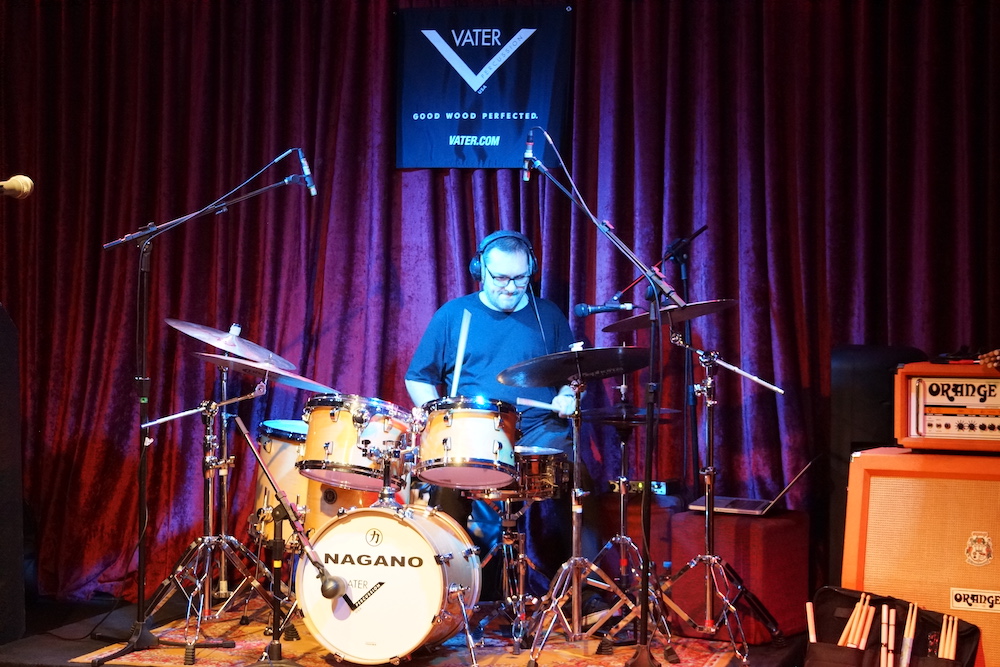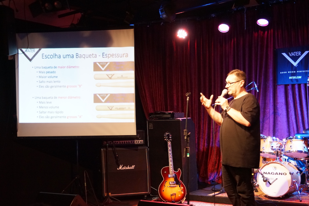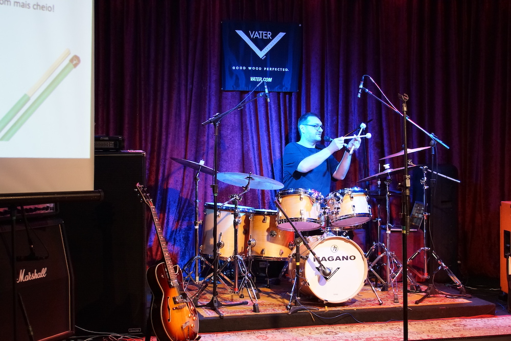 Durante o evento, Sandro contou um pouco da sua história musical e da sua experiência com as baquetas Vater, utilizando atualmente as baquetas modelo Manhattan 7A (VH7AW) e Bebop 525 (VHBB525).