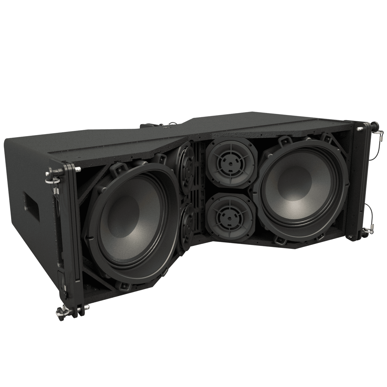 Os drivers de LF de 8″ são colocados atrás das paredes da buzina de HF, com um pequeno volume de ar na frente de cada driver, o que aumenta a saída na extremidade superior de sua faixa de operação. As aberturas de saída de LF estão separadas horizontalmente para fornecer um controle de padrão horizontal de LF.